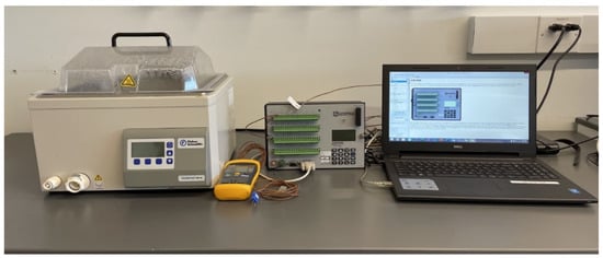Temperature history method (T-history): This method was developed for getting the thermal properties of the PCM for larger sample size. T-history method has been used to analyze/estimate PCM melting point, latent heat of fusion, supercooling, specific heat, and thermal conductivity for bulk materials. Thermal properties obtained from this testing can be compared to the data obtained from DSC to understand the effects of sample volume. In this research we utilized the T history method to record the supercooling degree [34]. Heating and cooling of the PCM samples were done in a water bath in which the water temperature was not held constant. Thermocouples (T type resolution) were used to measure the temperature. The thermocouple was placed in the sample and was connected to a data logger (CR 3000, Campbell Scientific, Logan, UT, USA) which recorded the temperature. Figure 3 shows the T-history test setup showing the water bath, datalogger and the laptop connected to use the PC200 software (version 4.5).