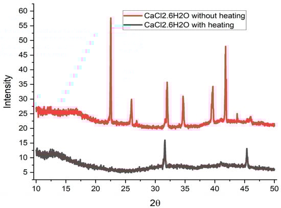 XRD analyses of CaCl2.6H2O for both the samples was performed to verify the structure of the crystals present in the PCM. Figure 5 shows the XRD data for both the samples. Diffraction patterns of both the prepared samples of CaCl2.6H2O were compared with the reference results of CaCl2.6H2O which was obtained from the Standard X-ray Diffraction powder patterns published by Institute of Material Research under National Bureau of Standards [35]. Table 3 shows the comparison for the samples with the peak location (diffraction patterns) in 2θ. CaCl2.6H2O without heating has almost the same location for the peaks as the reference sample peaks whereas for sample prepared with heating, peaks are missing. From these data, it is clear that the sample prepared without heating has similar diffraction patterns to the reference for CaCl2.6H2O, which means it actually contains the hexahydrate part of the PCM. While no reference is available for the tetrahydrate form, the sample prepared with heating shows a weaker diffraction pattern missing many of the peaks identified as hexahydrate.