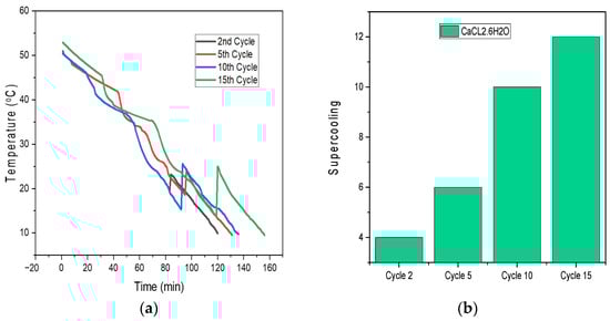 (a) T-history curve for 15 cycles for CaCl2.6H2O; (b) Increase in Supercooling graph for CaCl2.6H2O.