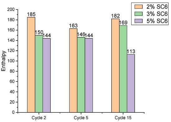 Enthalpy comparison for different proportion of SrCl2.6H2O for increasing thermal cycles.