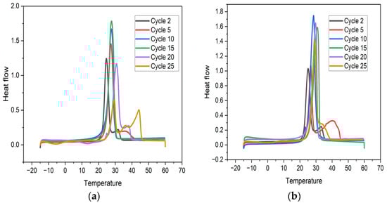 DSC curves for multiple cycles for (a) 3% KCl and 2% SrCl2.6H2O; (b) 5% KCl with 2% SrCl2.6H2O.