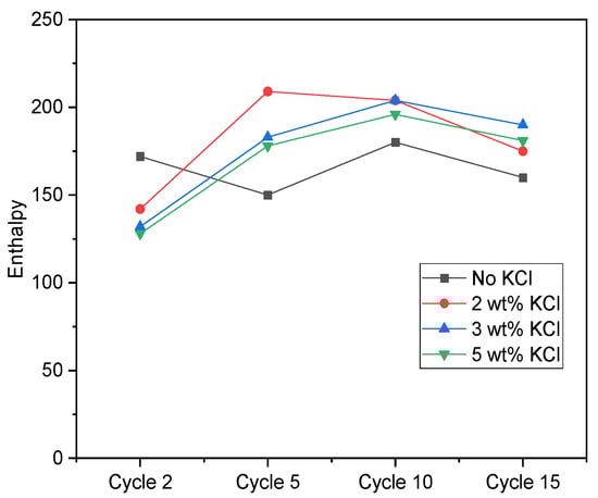 Figure 15 shows the comparison of enthalpy for CaCl.6H2O without any additives and with KCl at 2, 3 and 5 wt.% and 2 wt.% SrCl2.6H2O up to 15 cycles. It can be clearly seen that enthalpy increases on addition of KCl. This shows that KCl also increases the heat storage capacity and the improvement is maintained for the repeated thermal cycles.