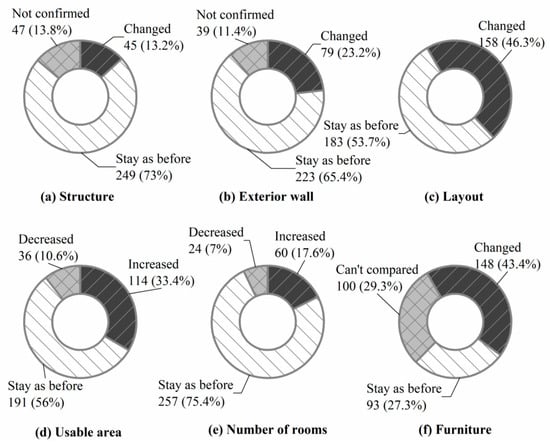 In terms of room quantity, 75.4% of households did not make any changes, which was mainly due to the structural layout. Some housing structural systems limit the possibility of adjusting the number of rooms, especially shear-wall and brick/concrete structures. The remaining 84 samples (24.6%) reported making adjustments to varying degrees, as shown in Figure 1e.