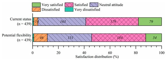 Figure 2 shows the distribution of respondents’ satisfaction with the current status of their housing and its potential for flexibility. Of these, 58.8% were satisfied or very satisfied with their housing layout and decoration, 4.1% were dissatisfied or very dissatisfied with their home, and the rest were neutral. In terms of potential flexibility, 54.2% were satisfied or very satisfied with the current flexibility of their housing, 11.4% were not satisfied or very dissatisfied, and the rest were neutral. It can be observed from the statistics that more than half of the families surveyed were generally satisfied with their living environment, while the remaining might consider how to improve their living environment.