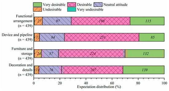 In order to further understand the specific needs of residents for housing renewal, we also conducted research on their expectations for flexibility in specific renovation components, including the following four areas: functional arrangement, device and pipeline, furniture and storage, and decoration and details (see Figure 3). Through statistical analysis, we found that the flexibility requirements of these contents were relatively high. For all four areas, 26.8% of respondents answered “very desirable”, 50.1% “desirable”, 4.7% “undesirable”, and less than 1% “very undesirable”. The distribution of residents’ expectations for each sub-item is represented in Figure 3. The demand for flexibility in functional layout was the lowest compared to the other three areas, while the demand for flexibility in interior finishes was the highest. The main reason for this is that the flexibility of furniture and decorative details is more closely related to the living feel of households and is easier to realize, while the adjustment of function and pipelines is more difficult for households to carry out.