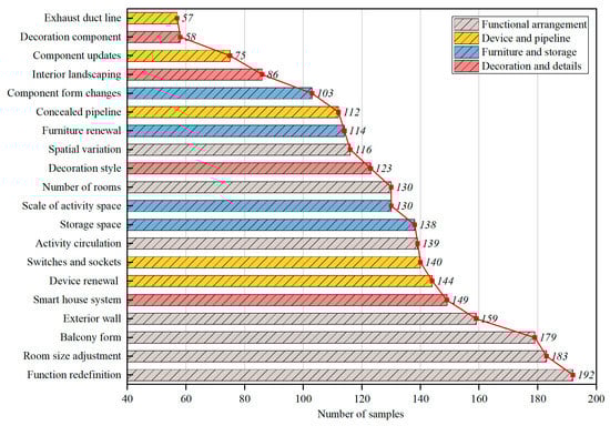 In addition, 20 items that belonged to the 4 areas were collected during the pre-research stage, including balcony forms, sockets and switches, storage spaces, etc. The respondents were allowed to choose multiple options for these items in their ideal residence. We collected data on the residents’ perception of the importance of each item and sorted them by frequency, as shown in Figure 4. The highest importance was assigned to “function redefinition”, chosen by a total of 192 respondents, followed by “room size adjustment” and “balcony form”, while the least flexibility demand was reported for the “exhaust duct line”, which only 57 respondents thought was important. From this result, it could be found that the flexibility requirements of the residents for the ideal house and the current house were not completely consistent, and the ideal home should have priority in the flexibility of functional arrangement, in comparison with the flexibility of interior finishes.