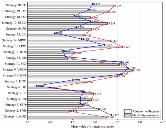 - The flexibility assessment and adoption willingness of strategies were correlated. Fourteen strategies showed significant differences between these two variables (p < 0.05), where flexibility assessment of the design strategies affected the adoption intention, whereas the other six strategies did not show significant differences between these two aspects. From the perspective of strategy application, top-level guidance should be strengthened to reduce the adverse impact of other factors, and those strategies with high flexibility evaluations should be preferred.