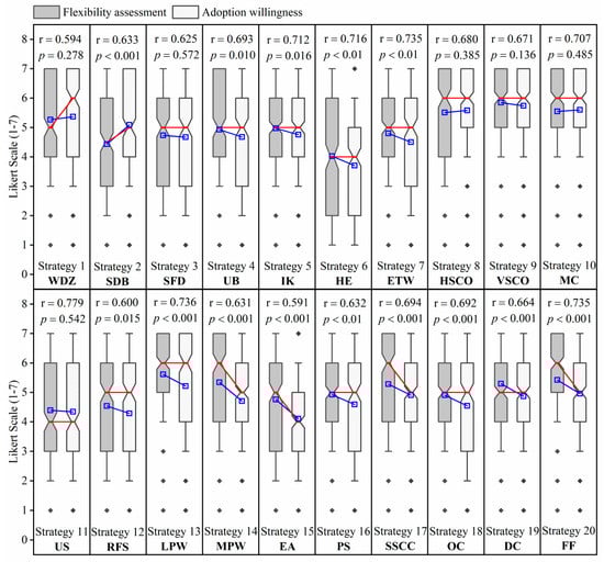 In order to reveal the correlation between the flexibility assessment and adoption willingness, and to understand the differences in the characteristics of each strategy, paired sample tests were conducted for all 20 strategies. The Pearson correlation coefficient (r value) for the flexibility assessment and adoption willingness of each strategy ranged from 0.591 to 0.779, which indicated that these two aspects were positively correlated (r > 0). To further study the significant differences (p-value) between these two aspects, the flexibility assessment and adoption willingness variables were treated as paired contrasting dependent variables, and 226 datapoints were calculated for each strategy (two-tailed test). From the results of the T-test, as shown in Table 6, 14 strategies (No. 2, 4, 5, 6, 7, 12, 13, 14, 15, 16, 17, 18, 19, and 20) showed significant differences (p < 0.05): some exhibited extremely significant differences (p < 0.001), while the difference between the other 6 strategies (No. 1, 3, 8, 9, 10, and 11) was not significant (p > 0.05).