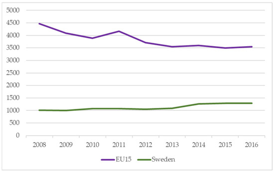 This paper focuses on the incidence rates of the above-mentioned data, i.e., number of accidents per 1000 employees, which is presented in Figure 4, Figure 5, Figure 6, Figure 7, Figure 8, Figure 9, Figure 10, Figure 11, Figure 12, Figure 13, Figure 14 and Figure 15. To illustrate the development of incidence rate over time, we also calculated the linear progression for each subtrade. The statistics concerning the number of employed individuals were collected from Statistics Sweden’s Register-Based Labour Market Statistics, see Figure 2,Figure 3. This is an annual survey based on the self-declarations of those who are self-employed as well as the employers’ control data. The subtrades were grouped according to the so-called SNI2007 code, which is the formal group classification format in Swedish working life with a basis in employment structures [25].