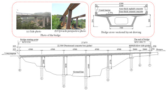 The study bridge is located on the Lianhuo Expressway in Henan Province, China. The bridge was constructed in 1992 and opened to traffic in 1995. The design load level of the bridge was as follows: automobile-over 20 and trailer-120. The total length of the bridge is 270.75 m. The main bridge was designed as a 5 × 45 m prestressed constant-section single box and single-chamber continuous box girder, and the approach bridge is a 2 × 20 m prestressed hollow slab. The bridge layout plan and photo are shown in Figure 1. The cross slope is set through the webs at different heights of the box girder. The height of the box girder at the center line is 3 m. The transversal width of the bridge is 12.0 m. The cross-section is arranged as a 0.5 m guardrail + 11 m lane + 0.5 m guardrail. The piers of the bridge are hollow piers with box sections, and the foundations of the piers are bored piles. The box girder was designed with C40 concrete, while the abutments and piers were designed with C30 concrete. The cap and pile foundations were designed with C25 concrete, and the bridge bearings are basin rubber bearings.