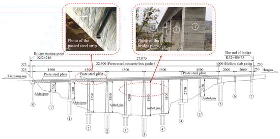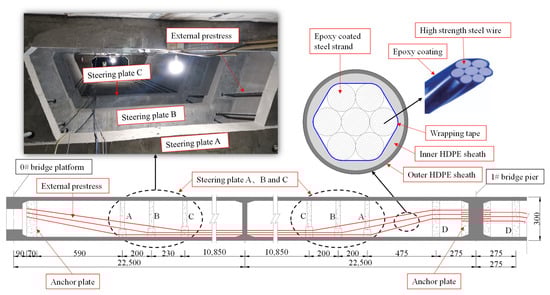 In 2005, the cracks of the prestressed concrete box girder of the bridge were closed, and the bridge was reinforced. This reinforcement included two aspects: (1) adding external prestressed steel bundles from the 1st span to the 5th span and (2) pasting steel plates on the inside of the web and attaching carbon fiber to the outside of the web. As shown in Figure 2, the external prestressed steel bundles were arranged along the longitudinal direction of the web. Six φ15-7 longitudinally prestressed steel strands were arranged in the box girder from the first span to the fourth span. Four φ15-9 longitudinally prestressed steel strands were arranged in the box of the fifth span. The steel strand was a low-relaxation epoxy-coated steel strand with a diameter of 15.24 mm. The strand’s cross-sectional area was 140 mm2. The standard strength was 1860 MPa, and its elastic modulus was 1.95 GPa.