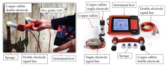 The steel corrosion potential visually reflects the corrosion activity of the steel bars in the concrete. As shown in Figure 3, the half-cell potential method was applied here to test the potential difference between the concrete of the box girder web and the reference electrode and to determine the probability of corrosion of the steel bars. Generally, when the potential difference is larger, the possibility of corrosion of the steel bars in concrete is greater. A test was conducted using the double electrode method. The results revealed that the minimum value of the potential level at the measurement point of the box girder web was −383 mV, the maximum value was −280 mV, and the average value was −325 mV. According to the relevant specifications [19], when the minimum value of rust potential is between −300 and −400 mV, there is rusting activity, and the probability of rusting is greater than 90%. Therefore, the test results indicate that there is corrosion activity of steel bars in box girder concrete, and the probability of the occurrence of corrosion is greater than 90%.