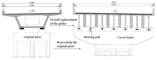 As shown in Figure 4, this scheme mainly involves removing the 5 × 45 m prestressed concrete box girders and modifying the original piers by adding cover girders and bearing pads, as well as replacing the main girders with 5 × 45 m prestressed concrete assembly T-beams. To meet the future demands of increased traffic volume, the full width of the bridge should be increased from 12.0 to 16.5 m. The cross-sectional arrangement of the T-girder is shown in Figure 5. Under this scheme, new T-beams are precast in the workshop and then connected to the whole via post-cast concrete. Both the T-beams and the post-cast concrete are made of C55 concrete, and the height of each T-beam is 2.9 m at the center line. The cross slope of the original bridge deck is adjusted from the original 1.5% to 2%. The deck pavement thickness is also adjusted.
