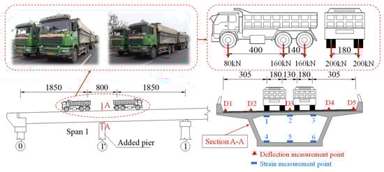 A load test is the most direct and effective method to evaluate the carrying capacity of a bridge [35,36,37,38,39]. The reinforcement effect of a bridge can be verified using a load test [5,40]. After the reinforcement is completed using Scheme 2, load tests are next conducted on the bridge using trucks. The test results are compared with theoretical calculations to verify the reinforcement effect. As shown in Figure 10, the load test here uses a three-axle truck with a total weight of 400 kN. According to the specifications in [19,40], the loading efficiency is controlled between 0.95 and 1.05. As shown in Figure 9, the mid-span section of span 1 is selected as the control section and loaded with four trucks. The strain and displacement of the control section are then tested.