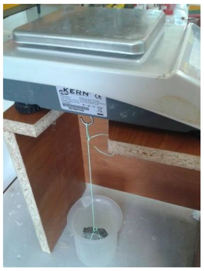 The volume of permeable pore space was calculated both for samples being taken from the noncarbonation area (near to rebars) and for samples taken from the carbonation area (near the specimen surface). Four samples were taken from near the surface area, and seven samples were taken from near the rebars area. The volume of permeable pore space was calculated according to ASTM C642 [29] slightly modified due to the thermal properties of polymers. The dry mass (A) was not determined by drying in an oven at a temperature of 100 °C. Samples were immersed in acetone and dimethyl ether and then left in vacuum for 24 h. Then the “saturated after immersion mass” (B) was determined by the immersion of the samples in water for 4 days and surface-drying of the samples with a towel. The “immersed apparent mass” (C) was determined by suspending the samples in water (Figure 3). Thus, the volume of permeable pore space (voids) (%) is calculated by Equation (1):