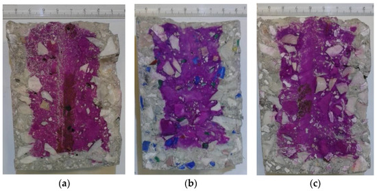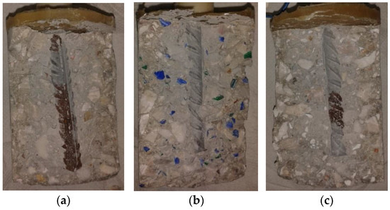 Specimen photos after splitting: (a) reference mix, (b) HDPE, (c) PP.