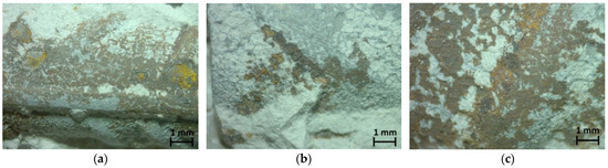 Figure 7 shows optical microscopy images (×50), and Figure 8 shows stereoscopy images of rebars of the three mixes. Only the pitting corrosion of rebars’ surface was revealed, while on the most part of each rebar, corrosion was not observed. A brief examination of the steel surface indicated that pits were formed under the rusted surface. It should be also noticed that iron oxides seem to be placed among neurons of their surface, and the iron oxide layer microstructure seems to be porous. This pitting corrosion is attributed mainly to chloride diffusion since, as mentioned before, carbonation was not observed near the rebars. Chlorides existed in the specimen since they were immersed in 3.5 wt% sodium chloride solution for 240 days, and after their primary testing [27], they were left in laboratory ambient air up to the age of 11 years for the second testing described in the present study. The chloride ions attack the passive layer, but unlike carbonation, there is no overall drop in the alkalinity of concrete. Chloride acts as catalysts to corrosion. They are not consumed in the process but help to breakdown the passive layer of oxide on the rebars’ surface and allow the corrosion process to proceed. The case of chloride ions transporting into the concrete mass is a complex phenomenon involving multiple mechanisms, such as diffusion, permeation, and capillary absorption. The initial mechanism seems to be suction, especially when the surface is dry due to the rapid absorption of salt water. The capillary movement of salt-laden water through the pores is followed by diffusion and is driven by moisture gradient. All these mechanisms involve the transport of chloride ions through macropores of a few millimeters in size, micropores, and continuous capillary pores down to nanometer size.