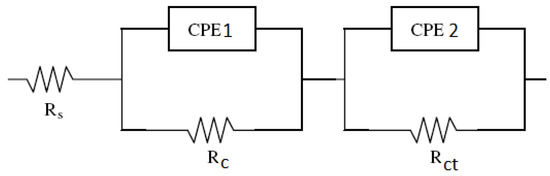 The electrochemical process of the corrosion of reinforced concrete is represented in terms of its electrical analogue of resistance, capacitance, or inductance in various arrangements corresponding to the possibilities of the physical model. Figure 9 illustrates the equivalent circuit found after fitting. In the equivalent circuit, Rs is the electrolyte resistance (concrete pore solution). A circuit with two parallel elements was connected in series with the resistance Rs to simulate the high-frequency loop that may be attributed to the dielectric properties of the concrete cover. It consists of two parallel elements, a resistance Rc and a constant phase element CPE1. They are related to the concrete pore solution and the porosity of hydrated concrete. The impedance of a constant phase element is defined as [30]: Z(ω) = Y0−1(jω)n, where Y0 is a parameter used in nonlinear least squares fitting, ω is the angular frequency, and n is a measure of arc depression defined as constant phase element power. For n = 0, the impedance simplifies an ideal resistor. For n = 1, a CPE simplifies as a pure capacitor, and as a result, the resistance obtained from fitting is very high (>108 Ohm.cm2). When n approaches 1, it is common practice to use the Y0 value as an approximation for capacitive behavior [35]. Another circuit with parallel elements, a resistance Rct and a constant phase element CPE2, was connected in series to the previous circuit with the two parallel elements. Rct is the electrode resistance (in this case, the rebar). The smaller this resistance, the greater the corrosion.