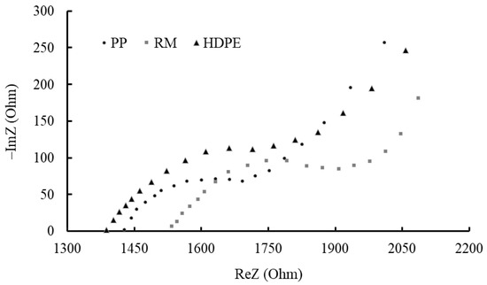 Electrochemical impedance spectroscopy (EIS) was performed on three reinforced concrete specimens of each mix, at the age of 11 years, in order to study the corrosion in a chloride environment and the effect of the partial substitution of conventional limestone aggregates with high-density polyethylene and polypropylene. Electrochemical impedance spectroscopy (EIS, or AC impedance) can determine a number of fundamental parameters related to corrosion progress, and it has been extensively used in corrosion research. The method analyzes the response of corroding electrodes to small-amplitude alternating signals (AC), which vary in a wide range of frequencies [30]. EIS was carried out with a three-electrode system using a 1286 Solatron Electrochemical Interface in the frequency range between 10 kHz and 10 mHz. A sinusoidal voltage of 15 mV was applied. For all specimens, the same setups were used for the purpose of minimizing errors caused by geometry and, thus, to obtain comparative results. The “Zplot” software (Version 3.5i) was used for running experiments and data acquisition. Equivalent electrical circuit fitting was performed with the “Zview” software.