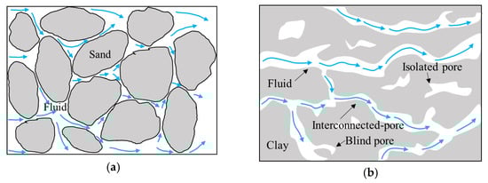 Clay is mainly composed of clay minerals, such as montmorillonite, kaolinite and illite. These mineral crystals are mostly made up of silicon sheets, brucite sheets and gibbsite sheets. However, the bonds holding the unit layers together may be sufficiently weak and easily influenced by the environment, so isomorphous substitution in all the clay minerals gives clay particles a net negative charge [66]. The net negative charges adsorb cations and polar water molecules to form DEL (Figure 1). Some scholars referred to several layers of water molecules adsorbed on the surface of the particles as strongly adsorbed water and believe that strongly adsorbed water could not flow [41]. Affected by the crystal structure of clay minerals, the clay particles are mostly small flakes. During deposition, the flakes are stacked in various forms by the interaction between electric field forces, gravity and van der Waals forces. This random stack creates many types of pores inside the clay (Figure 2). Among them, some pores are self-locking and the water in the pores cannot flow, these are called isolated pores and blind pores. However, for some small pores such as the gaps of the flakes, even though they are interconnected but the liquid still cannot flow through them due to the DEL and the adsorbed water [67]. Therefore, these small pores, the above isolated pores and blind pores are all invalid pores for clay seepage.