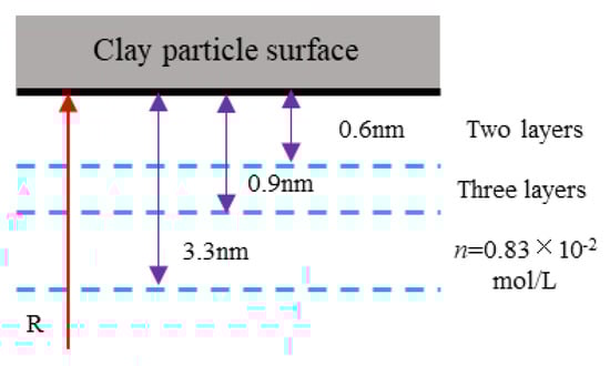 where δ is the thickness of the adsorbed water and S is the SSA. If there are two or three layers of water molecules adsorbed on the particle surface, since the diameter of a single water molecule is 0.3 nm [41], then the effective radius of the tube becomes R − 0.6 nm or R − 0.9 nm. At the same time, according to the theory of Gouy-Chapman, the ion concentration of the soil in nature is between 0.83 × 10−2 mol/L and 0.83 × 10−4 mol/L [66]. The thicknesses of DEL are 3.33 nm and 33.3 nm (Figure 5), but not all liquids in the DEL cannot flow.