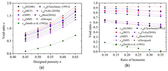 When submitting the SSA and the corresponding eeff obtained by various methods into Equation (12), the hydraulic conductivities can be obtained. In Figure 9, the hydraulic conductivities obtained by all methods increased with the increasing of e, and decreased with the increasing of bentonite content.