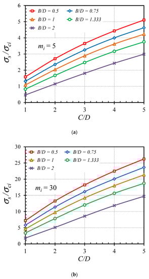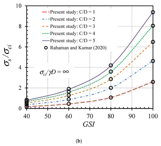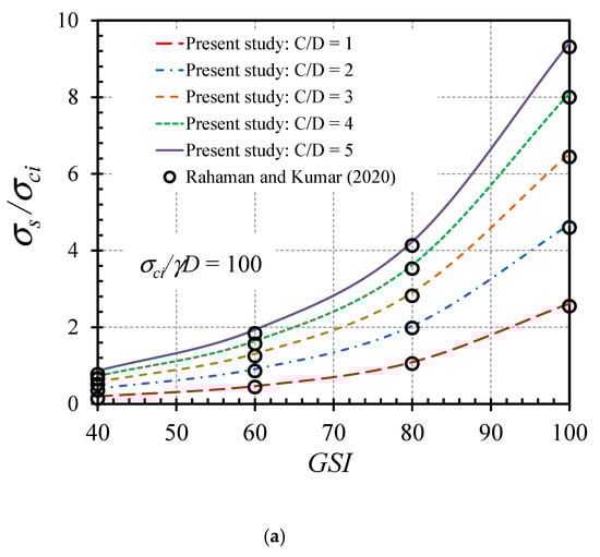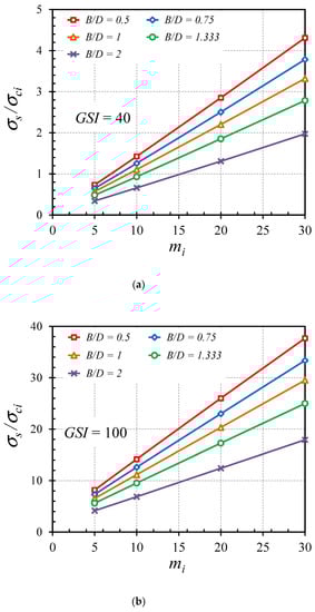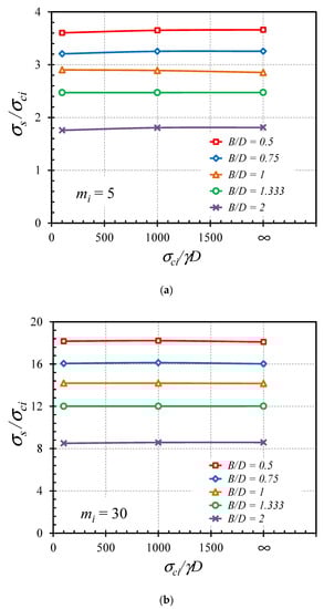 - The rock’s unit weight is in the range from 22–30 kN/m3 while the uniaxial compressive strength is taken in the range from σci = 0.25–250 MPa for weak to strong rocks. As a result, the dimensionless parameter σci/γD is set to be 100–∞, where the case of σci/γD = ∞ correlates to exceptionally high strength rock masses (σci is quite huge).
