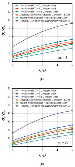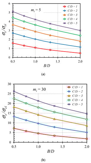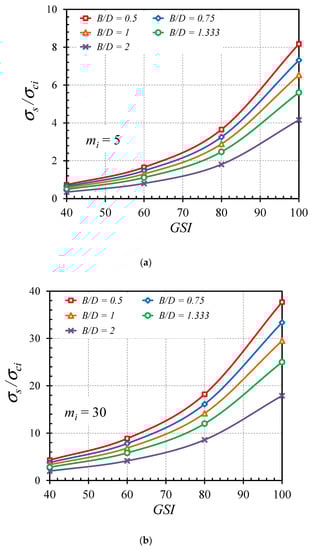 - The influence of mi and γD/σci on the normalized failure surcharge σs/σci is a linear relationship whereas that of B/D, C/D, and the GSI is a nonlinear relationship.