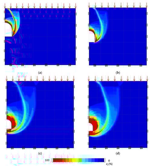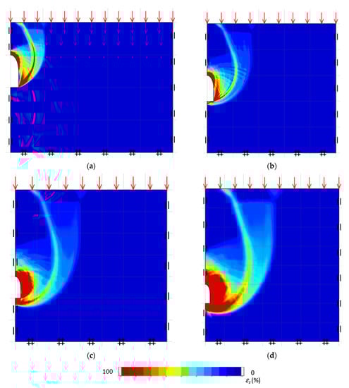 - Regarding the failure mechanisms, it was found that the influence of the GSI and mi on the overall failure mechanisms is neglectable. A horseshoe tunnel with a large value of B/D or C/D has a greater failure zone that penetrates extensively and deeply through the rock masses.