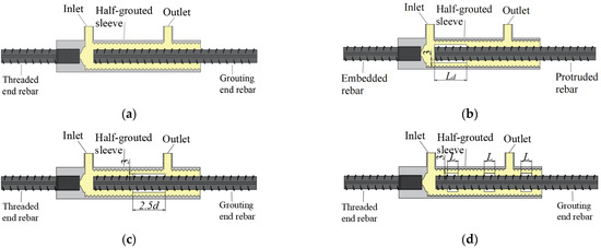 The construction of infrastructure in China has entered a critical period characterized by reduced emissions and energy savings. The transformation of the construction industry, which is a large carbon emitter, is imminent. Scholars study ways to reduce energy consumption and achieve green emission reduction [1,2,3]. Compared with conventional cast-in-place concrete structures, prefabricated concrete structures have considerable advantages such as environmental protection, energy savings, and reduced emissions [4,5,6,7]. To ensure the safety of a prefabricated concrete structure, the overall performance of precast component nodes is important. The grouted sleeve connection technology is one of the main forms of rebar connection between components [8]. Grouted sleeves mainly come in two forms: full-grouted sleeves (Figure 1a) and half-grouted sleeves (Figure 1b). Compared with a full-grouted sleeve, a half-grouted sleeve connection has a shorter connection length and higher construction efficiency. The half-grouted sleeve is mechanically connected by threads at one end and is grouted at the other end [9,10]. The connection performance of grouted sleeves is important for structural safety. Extensive research has been conducted on the grouting connection technology of grouted sleeves.