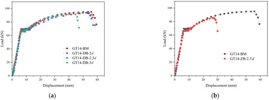 The load–displacement curves of the GT14-DB specimens (Figure 12a) are similar to those of GT14-BM in the elastic, yielding, and strengthening stages. The average yield load of GT14-BM is 55.10 kN, and the ultimate load is 94.41 kN. When the defect lengths are 2 d and 2.5 d, the average ultimate loads of the specimens are 93.63 kN and 93.10 kN, respectively, and the average ultimate displacements are 53.49 mm and 52.66 mm, which are slightly lower than those of the standard group specimens. When the defect length is 3 d, the average ultimate load is 90.79 kN, which is approximately 3.8% lower than those of the standard group specimens; the average ultimate displacement is 44.53 mm, which is approximately 19.2% less than those of the standard group specimens. When the length of the defect at the end of the rebar is greater than 2.5 d, the overall ductility of the specimen deteriorates rapidly.