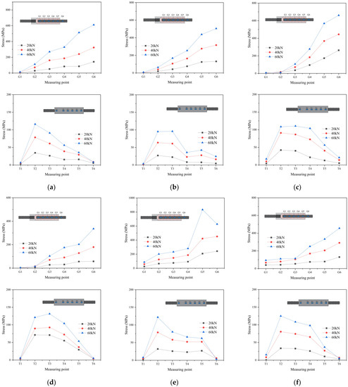 Load–stress curves. (a) GT14-BM-2. (b) GT14-DB-3d-2. (c) GT14-ZB-2.5d-1. (d) GT14-JB-3-2.5d-1. (e) GT14-DC-3-2.5d-2. (f) GT14-SP-4mm-1.