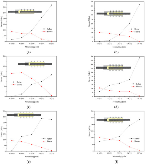The cohesive force between the rebar and the grouting material comprises the frictional force, chemical adhesive force, and mechanical bite force. The frictional force is mainly determined by the roughness of the contact surface and the pressure exerted by the expansion of the grouting material on the rebar. The surface of the grouting material has a chemical adhesive force. The mechanical bite force plays a key role, mainly provided by the transverse rib. The stress distribution at the grouting end of the specimen under a load of 45 kN was selected to study the stress transfer law between the rebar and the sleeve, as shown in Figure 16. The position of the rebar strain gauges (G1–G5) corresponds to that of the sleeve strain gauges (T2–T6).