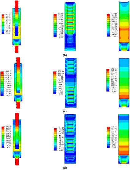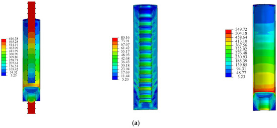 Figure 20a shows the von Mises stress distribution nephograms of the grouting end rebar, grouting material, and sleeve of the GT14-BM specimen. The maximum stress of the grouting end rebar in GT14-BM is 616 MPa. The rebar stress increases gradually from the threaded end to the grouting end. The stress distribution of the grouting material is uniform, and the maximum stress is 87 MPa. The maximum stress of the sleeve is 550 MPa. The stress of the sleeve decreases from the threaded end to the grouting end. Because of space restriction, only the stress nephograms of representative specimens are presented herein. Figure 20b–f shows the stress cloud diagrams of the grouting end rebar, grouting material, and sleeve when the ultimate load is reached in the GT14-DB-2.5d, GT14-ZB-2.5d, GT14-JB-3-2.5d, GT14-DC-3-2.5d, and GT14-SP-4mm specimens. The overall stress distribution trend of the GT14-DB-2.5d specimen is similar to that of the standard group. Since there was no bond between the rebar and the grouting material at the defect, their stresses changed only slightly. The overall stress of the grouting material was uniform. At the transverse rib of the rebar, the stress of the grouting material was high. Compared with the standard group, the sleeve exhibited a higher stress in the defect area. As shown in Figure 20c,d, the stress distributions of the rebar and sleeve of the GT14-ZB-2.5d and GT14-JB-3-2.5d specimens are largely the same as that of the standard group. The change in the stress of the rebar at defect was small. The stress nephogram of the grouting material shows that the grouting material can be divided into multiple stress sections. Figure 20e shows that the stress distribution of the GT14-DC-3-2.5d specimen is not uniform, and the stress on the defective side of the grouting material is higher than that on the non-defective side. Figure 20f shows the stress nephogram of the GT14-SP-4mm specimen. The stress on the defective side is greater than that on the non-defective side. The results showed that the stress distribution of the specimen in the finite element simulation was consistent with the experiment.