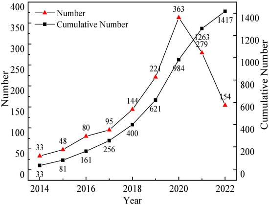 CiteSpace was developed based on the data format of WOS. The data downloaded from non-WOS databases needed to be converted into the data format of WOS first. This paper examines the literature related to the intersection of big data and the construction industry, with data sourced from the Web of Science (WOS) database. The Web of Science is the world’s largest comprehensive academic information repository, covering the largest number of disciplines. Using the rich and powerful search function of the Web of Science, you can easily and quickly find valuable scientific information and get a comprehensive understanding of research information about a certain discipline and a certain topic. The impact factor (IF), introduced by the Web of Science, has now become an internationally accepted index for evaluating journals. It is not only a measure of the usefulness and display of a journal but also an important indicator of a journal’s scholarship and even the quality of its papers. To cover the research status at the intersection of big data and the construction industry as comprehensively as possible, a subject search was selected with a cut-off time of 30 June 2022, at 0:00, for the topics “Big Data AND Construction, Civil Engineering, Building Energy, Architecture, Building, Road, Bridge”; a total of 1417 literature data were collected from 1 January 2014 to 30 June 2022, through manual reading and screening. The Web of Science only supports exporting 500 data items at a time currently. We had to select “Save to Other File Formats” in the export ribbon to enter the data export page. We set the relevant parameters on the export page. Then, we selected “Full Record and Cited References” in record content and then selected “Plain Text” in file formats. Then we clicked send to download the first 500 data, and then export the remaining data in the same order as above. All studies in this paper are based on the above data sets. The annual publication volume and annual cumulative publication volume statistics of the intersection of the Web of Science database big data and the construction industry are plotted as shown in Figure 1.