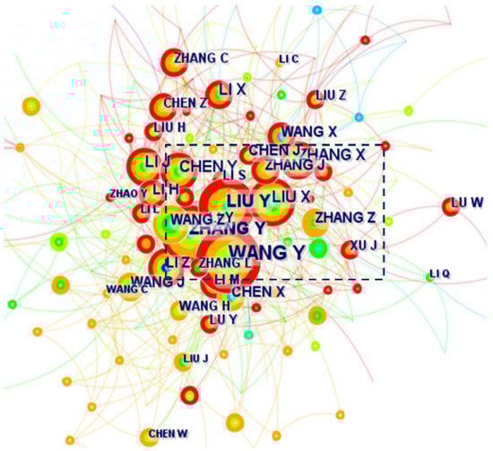 Identifying the core figures and research teams in the field and presenting the collaborative relationships between different researchers can be performed by analyzing the authors of the publications and their collaborative networks []. The author’s co-occurrence map is drawn according to the author’s cooperation in the cited literature. The occurrence of two authors in the same article is regarded as cooperation, which is mainly based on the author co-occurrence frequency matrix. By clicking on the “Author” function in CiteSpace, a network co-occurrence analysis of posting authors is performed based on the CiteSpace visualization tool, and each node in the figure represents each posting author. The size of the nodes indicates the number of articles published by the authors, with larger nodes indicating more articles published by the authors and vice versa. The lines between the nodes represent the cooperation status among the cited authors in the same literature. It means that there is cooperation between authors if there is a link between nodes and vice versa. The collaborative network knowledge graph of authors posting in the intersection of big data and construction industry research literature is shown in Figure 3, with the number of co-occurring nodes being 560, the number of connections being 3599, and the network density being 0.023. The top 20 authors posting according to the final CiteSpace algorithm are listed in Table 2.