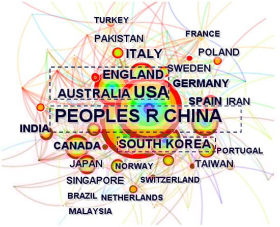 In the process of literary analysis, knowledge mapping originates from computer graphics, and by integrating cooperation analysis theory and pathfinding network algorithms, modern bibliometrics, and information science, a series of visual maps can be drawn to show the research hotspots, evolutionary trends, and other contents of research topics. It reveals the dynamic development law of the knowledge domain and can quantitatively and visually show the knowledge and the connection between knowledge []. The traditional literature analysis method is different from the quantitative literature analysis method using knowledge mapping, which is a qualitative analysis, and is based on a researcher’s subjective reading and summarizing to sort out and judge the literature in a certain research field as a whole []. It relies on the researcher’s reading volume and summarizing ability, and is subjective in nature, and it is difficult to grasp the research status comprehensively and accurately from the massive data []. With the rise and popularity of internet technology, quantitative analysis represented by knowledge mapping began to be widely used in review research, and the main tools for drawing knowledge maps in academia are CiteSpace, SPSS, VOSviewer, etc. Among them, CiteSpace is a scientific bibliometric visualization and analysis software developed by Prof. Chaomei Chen of Drexel University, based on the Java environment platform, which transforms a large amount of literature into an intuitive knowledge map through the size of nodes, the density of connections and other elements, displays and analyzes, the time zone layout, hot trends, evolutionary trends, and knowledge association status of disciplinary frontiers []. Due to its simple operation and clear visualization, this software has attracted widespread attention and applications []. We often need to face massive literature in scientific research work. To find out the key literature worthy of intensive reading, we explored the frontiers of the discipline, and found research hotspots that have become the first problems to be solved before carrying out the research. As an excellent bibliometrics software, CiteSpace can visually display the relationship between literature in the form of a scientific knowledge graph in front of the operator. It can not only help us sort out the past research track, but also make us a general understanding of future research prospects. The process of knowledge graph construction is generally divided into nine stages: determining the research topic and related terms, collecting data, extracting research frontier terms, time slicing, threshold selection, network simplification and consolidation, visual display, visual editing and detection, and verification of analysis results. Different maps have different problems and different connotations. A literature co-citation map, and an author co-citation map are used to analyze cited documents (references). An author co-occurrence map, an institution co-occurrence map, a national co-occurrence map, a co-occurrence of feature words, a co-occurrence of keywords, and a co-occurrence of discipline categories were analyzed for cited literature.