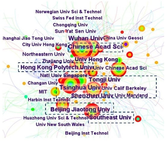 The analysis of research institutions and their collaborative networks provides some indication of the core institutions and the strength of their collaboration in a given research area, as well as an understanding of the academic status of each research institution in the field []. The co-occurrence map of institutions is drawn according to the cooperation of institutions in the cited literature. The occurrence of two author institutions in the same article is regarded as cooperation. The network cooperation analysis of graduate schools and institutions can be performed by clicking on the “Institution” function in CiteSpace. The collaborative network knowledge graph of research literature publishers at the intersection of big data and the construction industry is shown in Figure 5, with the number of co-occurring nodes being 628, the number of connections being 1142, the network density being 0.0058, and n in top-n is set to 60. It means that the 60 most frequently cited documents are extracted in each time slice. Table 4 shows the top 20 institutions in terms of the number of publications.