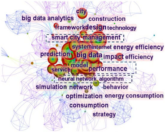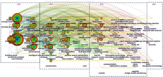 It can be seen from the keyword knowledge graph: the number of nodes and connected lines is high, indicating that the intersection of big data and building science has become increasingly mature in the last decade. The research scope and research areas are also becoming more and more extensive, and there is relatively more cross-research between the fields. The number of keywords with a frequency of one was counted as 126 using CiteSpace software, the keyword critical value model derived from Zipf’s law according to Dono-hue [], (T1 indicates the number of keywords with a word frequency of one), and T = 15.35 was calculated. The high-frequency words with a frequency greater than or equal to 16 times were screened, and the words, such as “big data (410 times)”, “construction”, and some other words that were not strongly targeted were removed. The finalized high-frequency words are “model”, “system”, “smart city”, “management”, and “neural network”. These keywords represent the research hotspots in the intersection of big data and building science, which means that the research at the intersection is mainly focused on the above five topics. The frequency of the “system” in the literature is 50, which is the most frequently co-occurrence term. The cooperation frequency of “model” and “management” are 47 and 35 respectively, ranking second and third. Among them, “system” and “model” have the highest centrality. It can be inferred that the research on cross-cutting areas is mainly focused on architectural modeling and engineering management. After reading the literature, we found that the research hotspots at the intersection of big data and the construction industry are as follows: