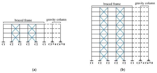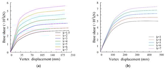 - For low-rise, PCF-BRB structures, the recommended range of stiffness ratio should be 1.5 ≤ k ≤ 3.0; for high-rise PCF-BRB structures, the recommended range of the stiffness ratio should be 3.0 ≤ k ≤ 4.0. In the lateral stiffness ratio design method, the stiffness ratio can be used for the detailed design of BRBs.