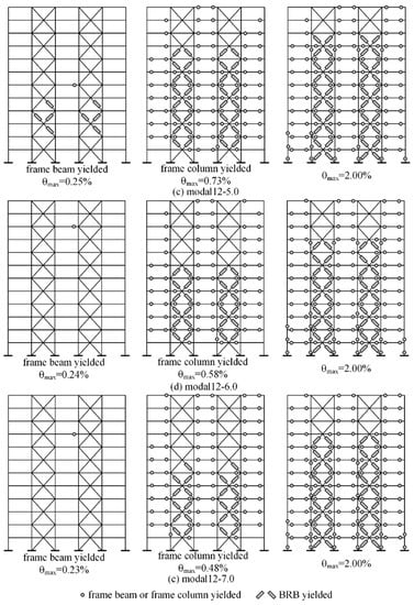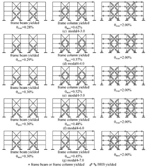 - For both the 4- and 12-story PCF-BRB structures, when the stiffness ratio was over 4.0 and 5.0, respectively, the damage mechanism of the structures changed from the beam hinge damage mechanism to the beam-column hinge mixing damage mechanism. Further increasing the stiffness ratio resulted in the story-damage mechanism of the PCF-BRB structures, which significantly impacted the structural seismic performance.