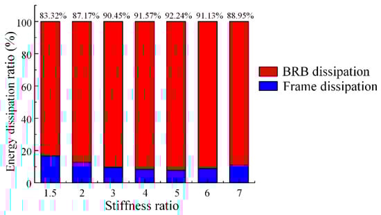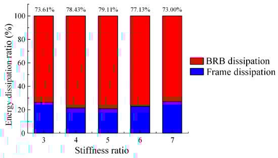 - For the 4-story PCF-BRB structure and the 12-story PCF-BRB structure, the energy dissipation ratio of BRBs reached the maximum when the stiffness ratio increased to 5.0. When the stiffness ratio continued to increase, the consumption ratio decreased instead due to the delay of BRB entering the plastic state, which led to less cost-efficiency.