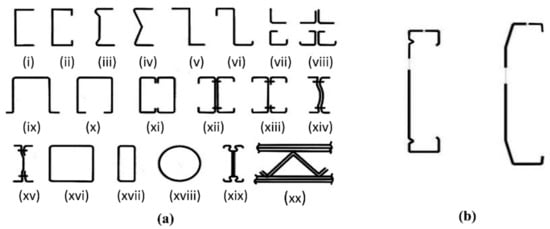 Cold-Formed (CF) sections are structural products formed by cold roll-forming or press braking of metal sheets into different shapes at ambient temperature []. Over the past few decades, these CF sections have been extensively used in the modern construction industry both as primary and secondary structural members, by overruling their hot-rolled counterparts [,,,]. High specific strength, ease of fabrication, transportation, installation, and handling, and high dimensional accuracy observed in CF sections have triggered this advancement [,,].