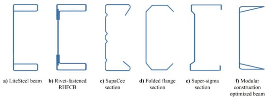 Succeeding many studies conducted on conventional CF sections, Keerthan et al. [] and Keerthan and Mahendran [] conducted experimental studies on LiteSteel Beams (LSBs), initiating web crippling investigations on unconventional CF sections (Figure 3). In these studies, authors proposed new design rules unique for LSBs. These design guidelines were developed based on the Direct Strength Method (DSM). Steau et al. [,,] conducted experimental studies on the web crippling behaviour of rivet-fastened Rectangular Hollow Flange Channel Beams (RHFCBs) subjected to all four loading conditions. Based on these experimental investigations the authors developed new web crippling design equations for rivet-fastened RHFCBs considering both flange fastened and unfastened conditions. Subsequently, Sundararajah et al. [,,], Gatheeshgar et al. [,] and Thirunavukkarasu et al. [] conducted combined empirical and numerical investigations on the web crippling response of SupaCee sections, optimized CF sections and modular construction optimized beams, covering the full range of unconventional cold-formed sections. Based on each of these studies authors have developed new web crippling design guidelines appropriate for each sectional geometry.