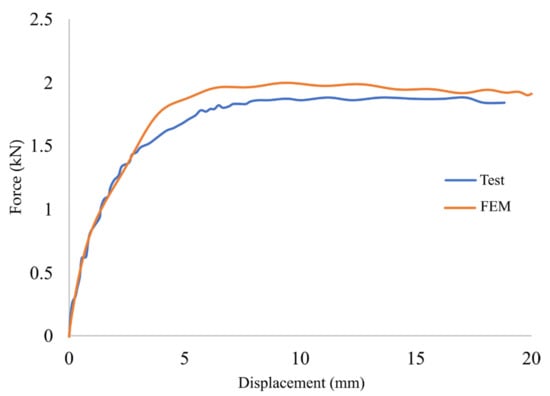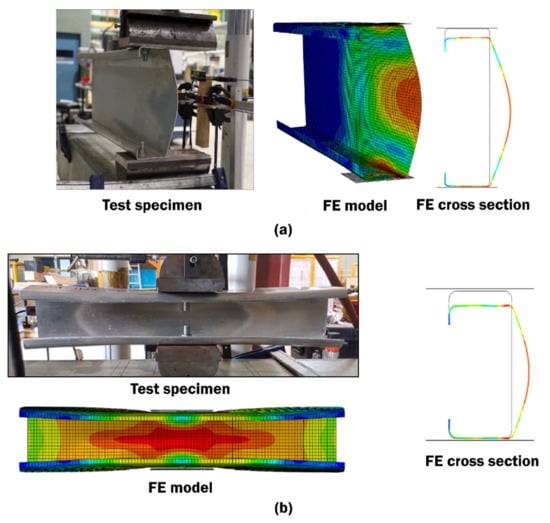 Being dependent upon empirical formulae, design guidelines developed via experimental studies, are restricted to certain cross-sectional geometries, loading conditions, and material properties []. To overcome this issue experimental investigations are often followed by numerical investigations, which enable the coverage of a broader spectrum of section geometries, loading conditions, and material properties []. With the increasing developments in the field of technology, numerical investigations have become a reliable alternative for experimental tests, provided that adequate validation of the numerical models is being carried out []. Finite Element Analysis (FEA) is frequently regarded as the most widely used numerical investigation technique. The study conducted by Sivakumaran [] is considered to be one of the pioneering finite element-based web crippling studies conducted on lipped CF channel sections. The ADINA [] software was used by the author to simulate the web crippling response of CF sections subjected to IOF loading condition. There the author was able to achieve satisfactory agreement in between Finite Element (FE) predictions and experimental results, thus proving the reliability of ADINA software in predicting web crippling capacities. Since then, numerical investigations conducted using shell FE models were extensively used to model the web crippling behaviour of CF sections. ABAQUS [] and ANSYS [] are some such commercial and general-purpose FE programs that are commonly used in analyzing the web crippling behaviour of CF sections [,,,,,,]. Comparison of the failure modes between these numerical studies and experimental studies demonstrates the high reliability of numerical investigations, in simulating actual web crippling behaviour observed under experimental conditions (Figure 4).