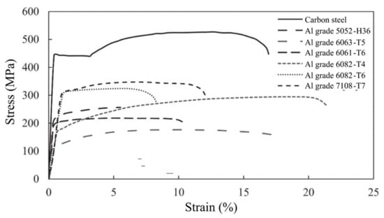 Stress strain curve corresponding to Carbon steel and Aluminium alloys [].