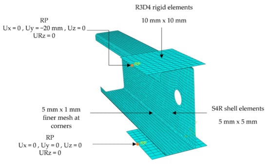 Considering the thin-walled nature of the CF lipped channel sections, four-node general-purpose deformable shell element S4R was used to model the channel sections. Adequacy of the S4R element in simulating the web crippling response of CF sections has been proved in many past studies [,]. Considering the relatively stiff nature, top and bottom bearing plates were modelled as rigid bodies. Three-dimensional quadrilateral rigid element (R3D4) was used in modelling the bearing plates. Mesh sizes were appropriately selected to increase the accuracy of the numerical results, while keeping the computational time to a minimum. Based on the numerical studies conducted by Sundararajah et al. [], web perforated lipped channel sections were modelled using a 5 mm × 5 mm mesh size. Ensuring proper transfer of stresses at the web flange juncture, a finer mesh size (5 mm × 1 mm) was used around the corner regions of the section. A mesh size of 10 mm × 10 mm was used for the bearing pates. Figure 6 shows the mesh sizes and element types used in the FE model.