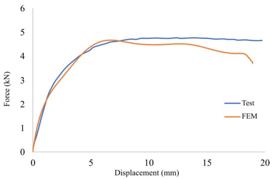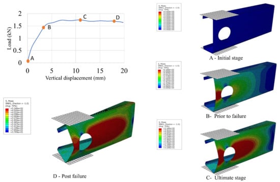 Simulating the experimental setup, contact between the top and bottom bearing plates and the CF lipped channel section was modelled considering surface to surface contact technique. Contact surfaces of the bearing plates were considered as the master surface, while the contact surface of the channel section was considered as the slave surface. In simulating the contact behaviour penetration of the slave surface into the master surface was prevented by adhering the “hard” contact relationship. In each model, a coefficient of friction of 0.4 was used to account for the friction between contact surfaces [,]. Boundary conditions were carefully assigned to replicate the experimental behaviour. Simply supported behaviour of the top bearing plate was simulated by restraining it against translational movements in the X and Z directions and rotations about Z axis. Simulating the displacement-controlled loading conditions, translations movements in the Y axis were enabled. To simulate the experimental behaviour all translational movements and rotational movements about Z axis were restricted at the bottom bearing plate. These boundary conditions were applied to the bearing plates through a reference point (Figure 6). Furthermore, “smooth step amplitude” was considered in modelling the effect of the transverse load on the channel section. Figure 7 shows the failure mode progression observed during the FEA of this study along with the respective load-displacement plot.