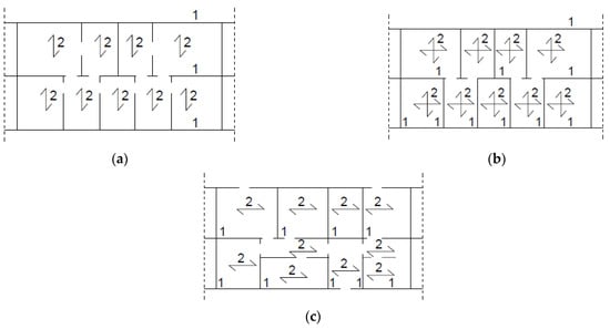 Typical configuration of panels: (a) longitudinal (b) cross-wall (c) transverse, where 1—load bearing walls and 2—direction of floor spans.