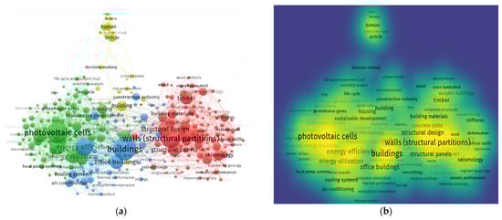 The results—the co-occurrence visualization of keyword networks, their connections and the density associated with their correlation frequency—are presented in Figure 5a. The size of a keyword node denotes its frequency, whereas its location denotes its co-occurrence in publications. The colours red, green, blue, yellow and purple were used to identify five clusters and to highlight their co-occurrence in distinct publications. Cluster 1 (red) contained 102, cluster 2 (green) 101, cluster 3 (blue) 66, cluster 4 (yellow) 22 and cluster 5 (purple) 1 keyword. In Figure 5b, yellow, green and blue colours represent the density concentration of keywords. Yellow represents the highest density while blue the lowest. The visualisation can not only help in finding trends in large panel system buildings, but also guide future authors to choose presented keywords to find published data on a specific topic. From the results, one can see that the topics concerning large panel system technology are grouped in four large clusters. The red cluster represents the construction: structural design of buildings, construction materials and durability of structures (stiffness, seismology, deformation and retrofitting). The green cluster is connected to the environment and sustainable development, with the most used keyword photovoltaic cells. The blue cluster deals with energy efficiency and its utilization. The last big cluster, yellow, presents social factors in large panel system technology. Considering all keywords together, there is a strong trend in broadly understood modernization of LPS. Improving living conditions, limited environmental impact and extending service life seem to be popular topics. However, there are no keywords for words reusing, recycling or demolition, indicating that there are few or no research studies concerning re-use of panels or recycling concrete in the event of planned or accidental demolition.